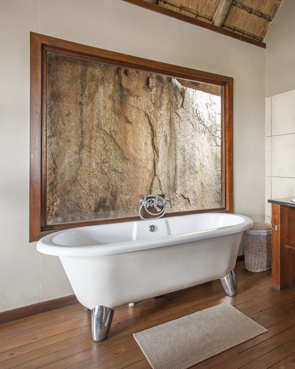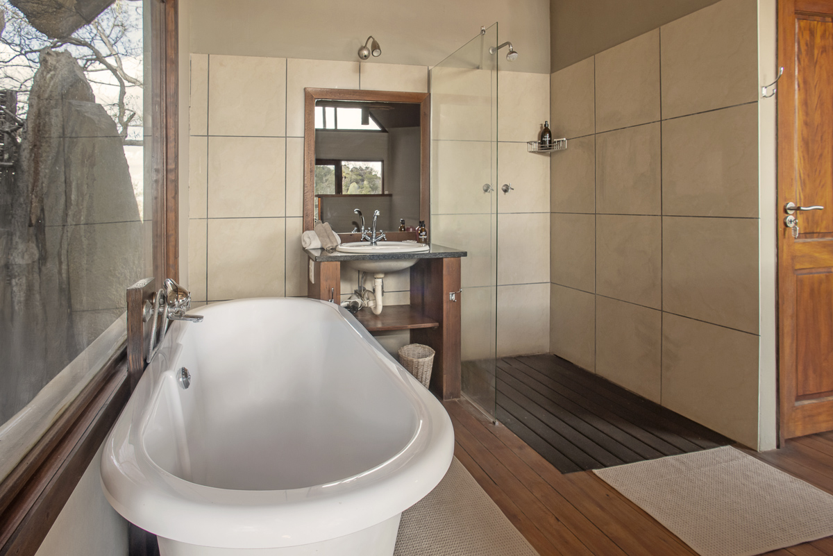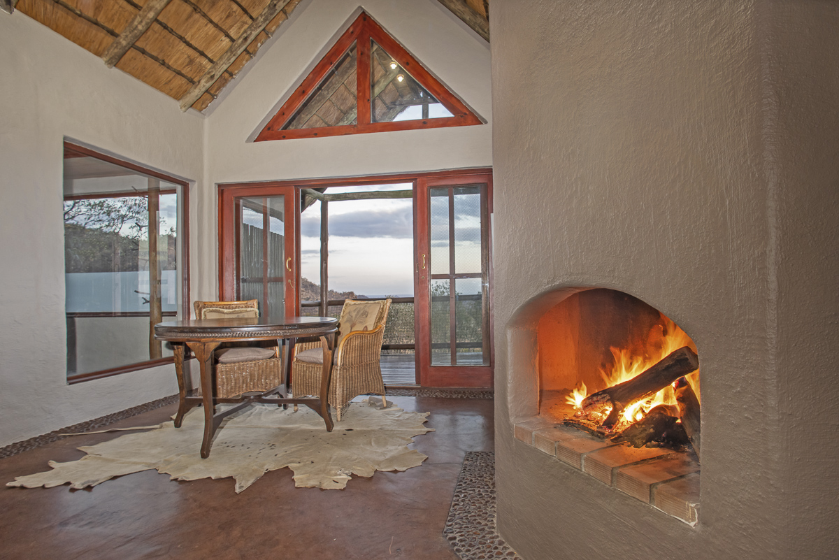 The lodge’s main suite — spacious, elegant, and private. It features a cozy fireplace, a shower with a view, a sitting nook, and a private balcony opening south across the reserve. Huge windows frame the granite boulders, softly lit at night, bringing the koppie inside.