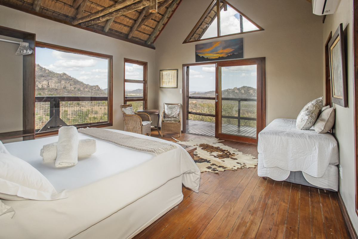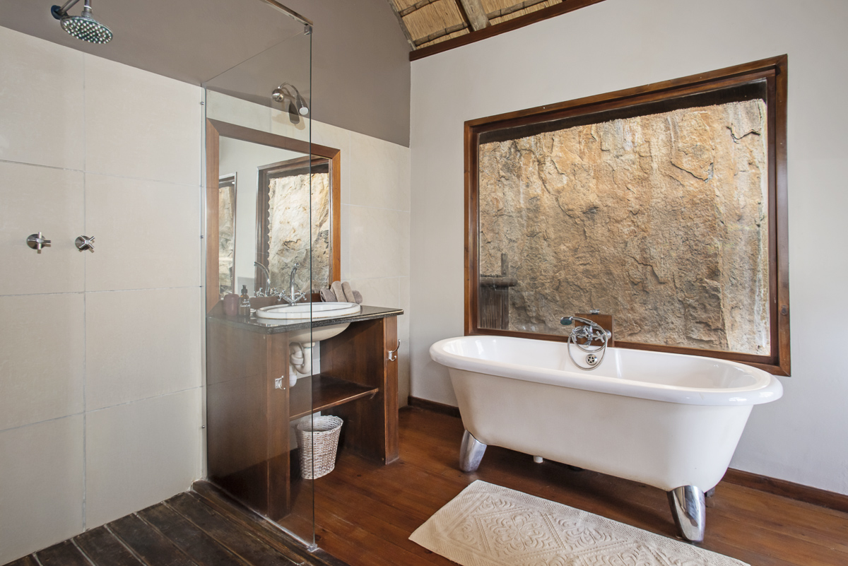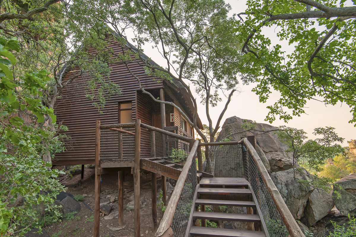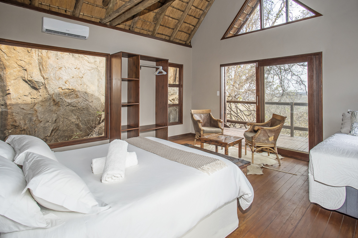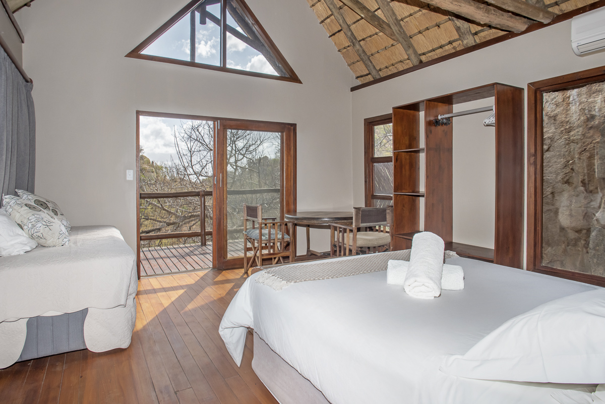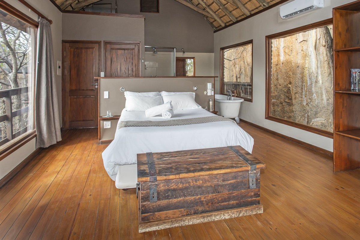 Named after the series of koppies resembling a clenched fist, this wooden cabin offers unmatched panoramas. Enjoy a private balcony with vistas toward the Knuckles, an indoor and outdoor shower, and a bath. The room is framed by huge windows on both sides — granite boulders lit at night on one, open views of the Knuckles on the other.