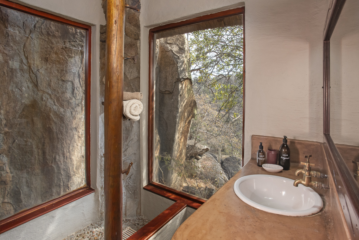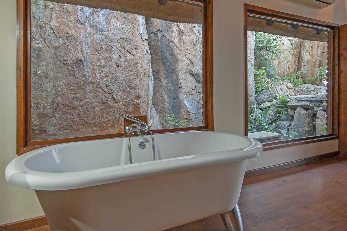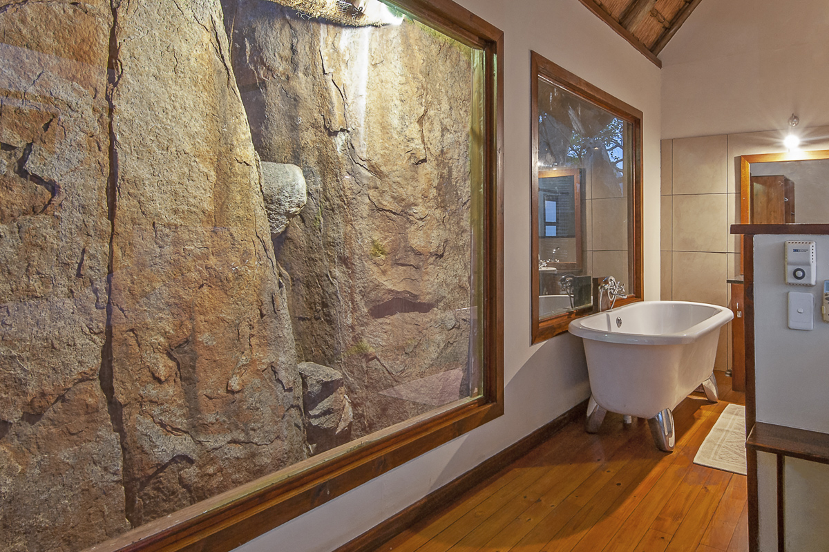 A light-filled room with a shower tucked beside the granite, a sitting nook, and a private balcony overlooking the forest. Expansive windows invite the green of the bush inside, with granite glowing warmly after dark.
