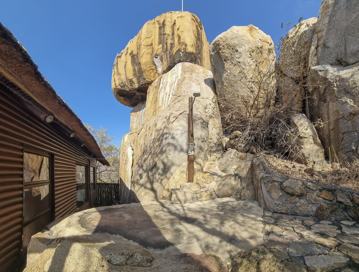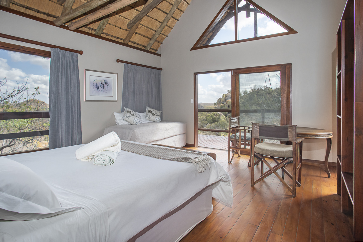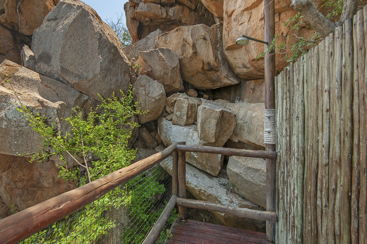 Perched high on the koppie, Klipspringer Retreat stands in quiet solitude, a wooden cabin shaped for peace and privacy. Named after the graceful pair of klipspringers that roam the rocks and are often seen from its balcony, it feels part of the land itself. Inside, a bath and shower invite slow moments of comfort; outside, beneath the granite boulders, another shower opens to the sky. Expansive windows draw in the view, where golden light drifts across stone and horizon.