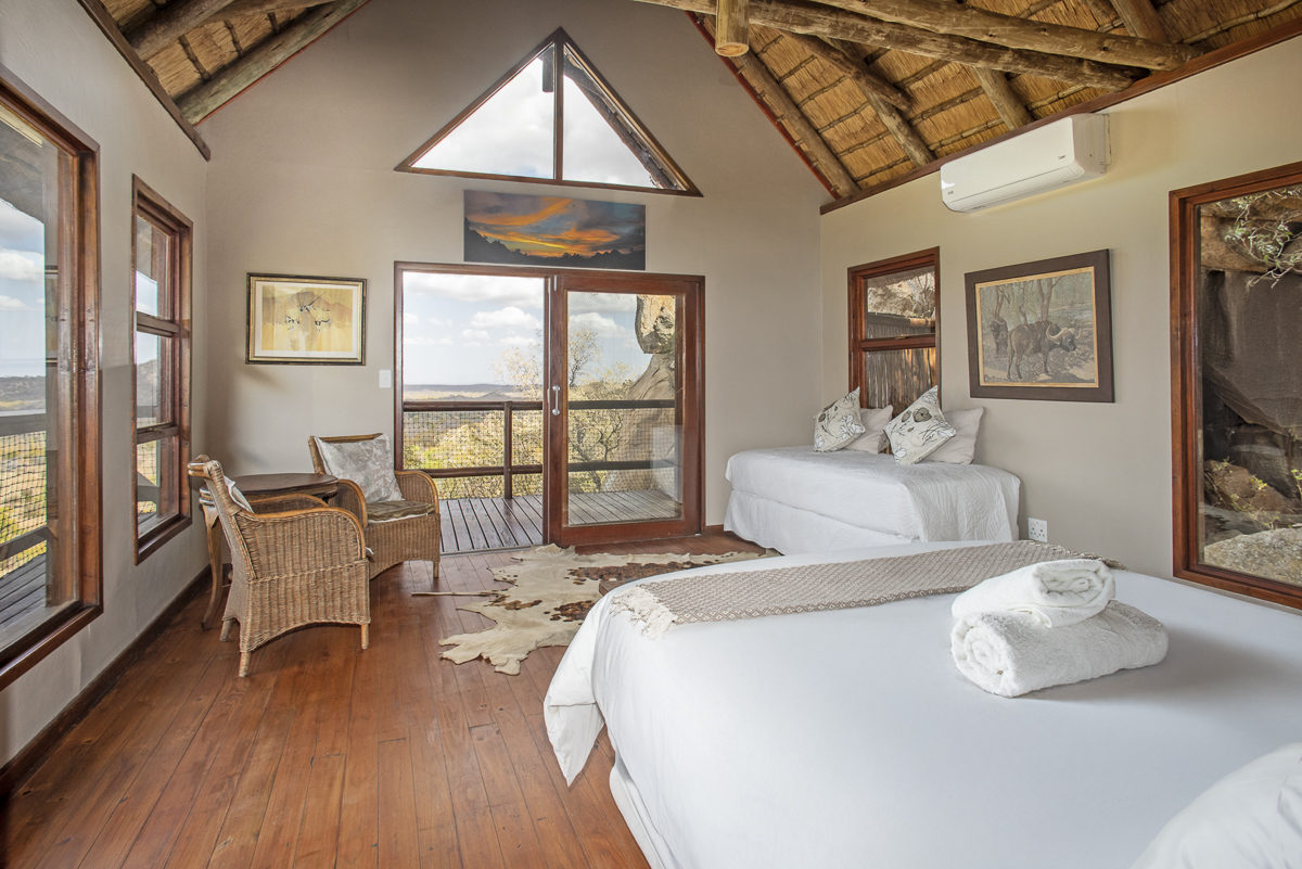 This intimate wooden cabin faces east and south, with a private balcony that catches the sunrise and overlooks the reserve. Inside, there’s a bath and shower, while outside, a granite-framed shower blends bathing with nature. Dassies bask on the sun-warmed rocks just outside, making this suite truly their lair as well as yours.